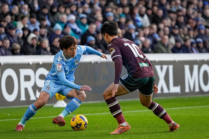 Tatsuhiro Sakamoto, of Coventry City dribbles the ball while being marked by Eom Ji-Sung, of Swansea City during the Sky Bet Championship match Coventry City vs Swansea City at Coventry Building Society Arena, Coventry, United Kingdom, 26th December 2025, Credit:Maynard Manyowa/News Images / Avalon