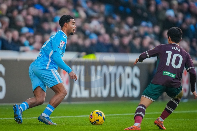 Milan van Ewijk, of Coventry City dribbles the ball while being marked by Eom Ji-Sung, of Swansea City during the Sky Bet Championship match Coventry City vs Swansea City at Coventry Building Society Arena, Coventry, United Kingdom, 26th December 2025, Credit:Maynard Manyowa/News Images / Avalon