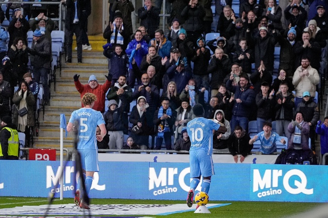 Ephron Mason-Clark, of Coventry City celebrates his goal to make it 1-0 during the Sky Bet Championship match Coventry City vs Swansea City at Coventry Building Society Arena, Coventry, United Kingdom, 26th December 2025, Credit:Maynard Manyowa/News Images / Avalon