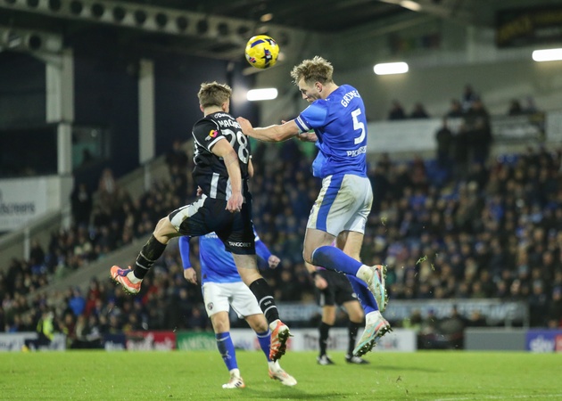 Jamie Grimes of Chesterfield heads the ball clear during the Sky Bet League 2 match Chesterfield vs Notts County at SMH Group Stadium, Chesterfield, United Kingdom, 26th December 2025, Credit:Richard Bierton/News Images / Avalon