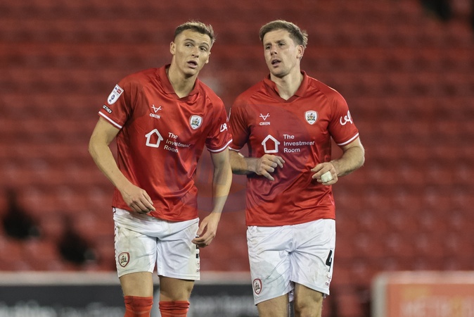 Jack Shepherd speaks with Marc Roberts of Barnsley during the Sky Bet League 1 match Barnsley vs Mansfield Town at Oakwell, Barnsley, United Kingdom, 26th December 2025, Credit:Mark Cosgrove/News Images / Avalon