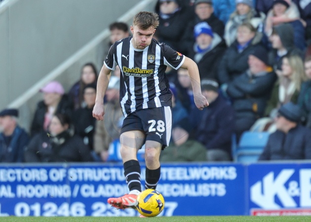 Lewis Macari of Notts County passes the ball during the Sky Bet League 2 match Chesterfield vs Notts County at SMH Group Stadium, Chesterfield, United Kingdom, 26th December 2025, Credit:Richard Bierton/News Images / Avalon