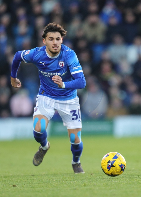 Devan Tanton of Chesterfield in action during the Sky Bet League 2 match Chesterfield vs Notts County at SMH Group Stadium, Chesterfield, United Kingdom, 26th December 2025, Credit:Richard Bierton/News Images / Avalon