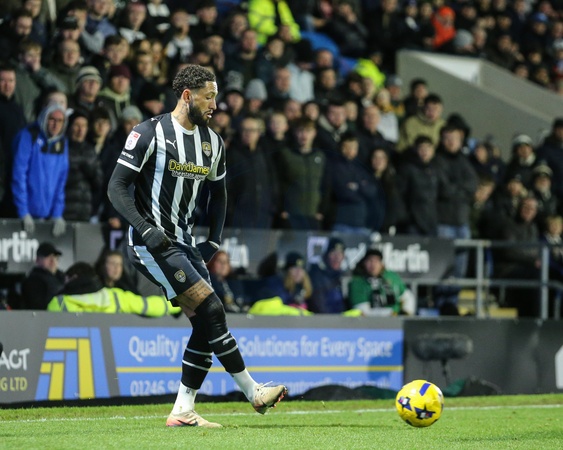 Kellan Gordon of Notts County passes the ball during the Sky Bet League 2 match Chesterfield vs Notts County at SMH Group Stadium, Chesterfield, United Kingdom, 26th December 2025, Credit:Richard Bierton/News Images / Avalon