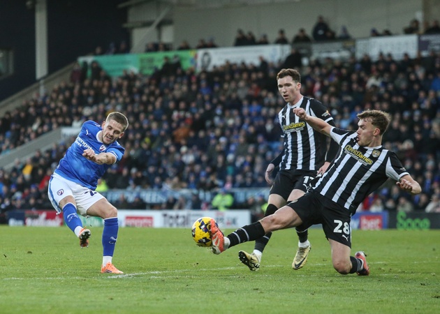 Lewis Macari of Notts County blocks shot from Ronan Darcy of Chesterfield during the Sky Bet League 2 match Chesterfield vs Notts County at SMH Group Stadium, Chesterfield, United Kingdom, 26th December 2025, Credit:Richard Bierton/News Images / Avalon