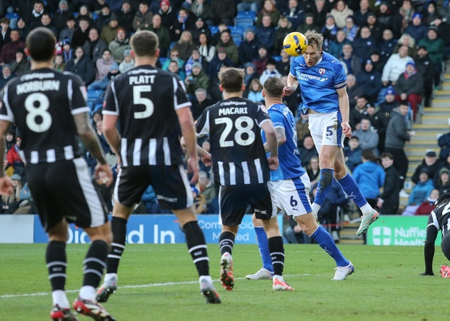 Jamie Grimes of Chesterfield jumps up to win the high ball during the Sky Bet League 2 match Chesterfield vs Notts County at SMH Group Stadium, Chesterfield, United Kingdom, 26th December 2025, Credit:Richard Bierton/News Images / Avalon