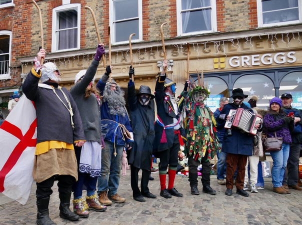 The Wantage Mummers perform their annual play in the market square for the crowds of people on Boxing Day. Mummers' plays are folk plays performed by troupes of amateur actors, traditionally all male, known as mummers or guisers. Historically, mummers' plays consisted of informal groups of costumed community members that visited from house to house on various holidays. The word Mummer can be traced back to ancient Greece. It is derived from Momus, the personification of satire and mockery. It's also found in an old English word mommer, which relates to miming, masking and frolicking. The Wantage Mummers play has been performed since the early seventies and is a typical mid-Berkshire/Oxfordshire mummer's play of the hero-combat type, based on traditions from the villages around Wantage, like Steventon in Oxfordshire, Credit:Geoffrey Swaine / Avalon