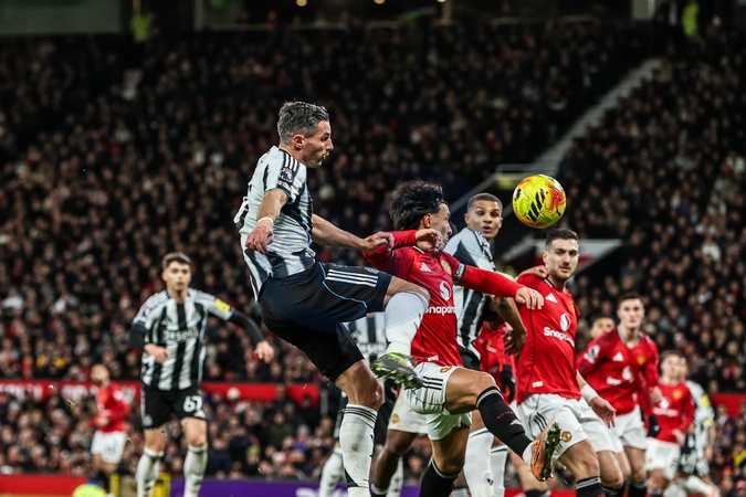 Fabian Schar of Newcastle United takes a shot on goal from a corner during the Premier League match Manchester United vs Newcastle United at Old Trafford, Manchester, United Kingdom, 26th December 2025, Credit:Ae Cosgrove/News Images / Avalon