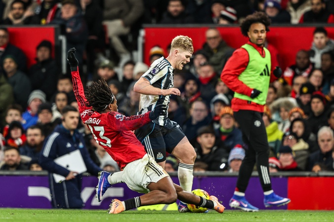 Lewis Hall of Newcastle United is tackled by Patrick Dorgu of Manchester Untied during the Premier League match Manchester United vs Newcastle United at Old Trafford, Manchester, United Kingdom, 26th December 2025, Credit:Ae Cosgrove/News Images / Avalon