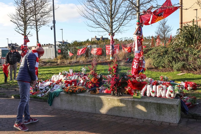 Diogo Jota flowers laid outside Anfield during the Premier League match Liverpool vs Wolverhampton Wanderers at Anfield, Liverpool, United Kingdom, 27th December 2025, Credit:Mark Cosgrove/News Images / Avalon