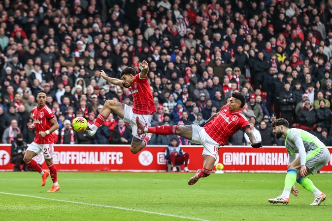 Igor Jesus of Nottingham Forest and Morgan Gibbs-White of Nottingham Forest both jump up for a shot on goal during the Premier League match Nottingham Forest vs Manchester City at City Ground, Nottingham, United Kingdom, 27th December 2025, Credit:Ae Cosgrove/News Images / Avalon