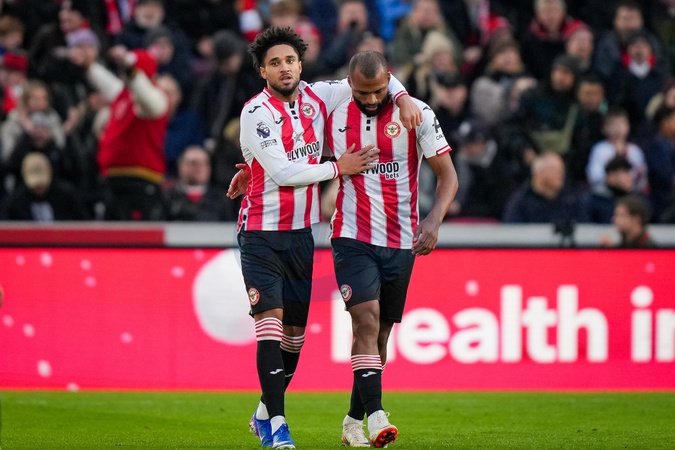 Kevin Schade of Brentford celebrates his goal to make it 1-0 with Igor Thiago of Brentford during the Premier League match Brentford vs Bournemouth at The Gtech Community Stadium, London, United Kingdom, 27th December 2025, Credit:Maynard Manyowa/News Images / Avalon