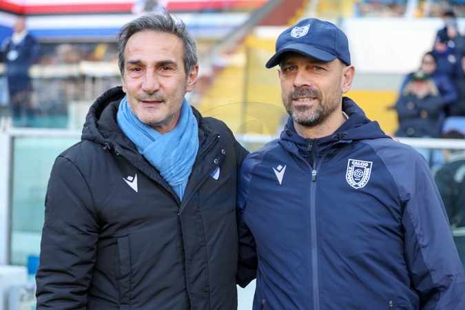 Ferraris Stadium. Football, Serie B, Day 18, Sampdoria vs. Reggiana. Pictured are Coach Gregucci and Sibilani. Genova, Italy 27 December 2025, Credit:Gabriele Siri / Avalon