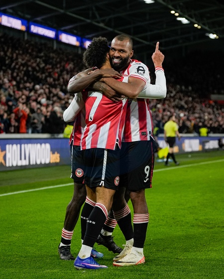Kevin Schade of Brentford celebrates his goal to make it 3-0 with Igor Thiago of Brentford during the Premier League match Brentford vs Bournemouth at The Gtech Community Stadium, London, United Kingdom, 27th December 2025, Credit:Maynard Manyowa/News Images / Avalon