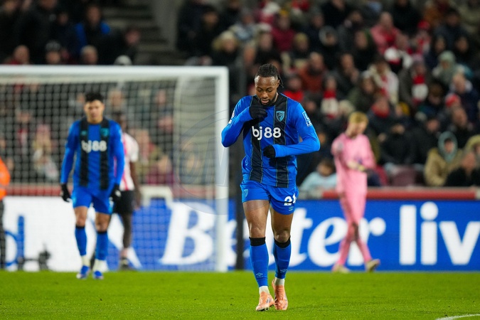Antoine Semenyo of Bournemouth celebrates his goal to make it 3-1 during the Premier League match Brentford vs Bournemouth at The Gtech Community Stadium, London, United Kingdom, 27th December 2025, Credit:Maynard Manyowa/News Images / Avalon