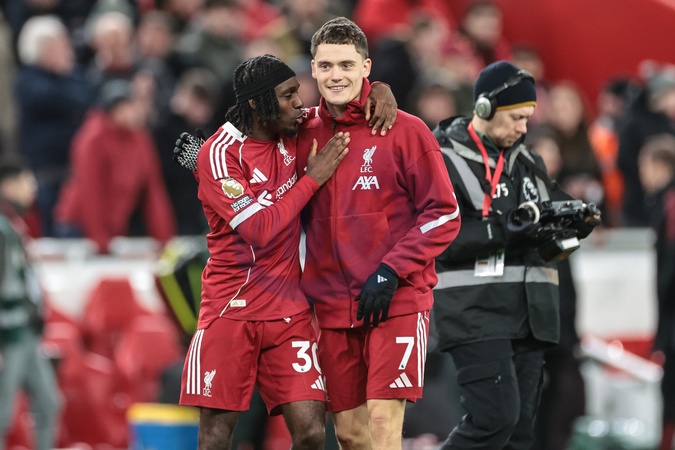 Jeremie Frimpong and Florian Wirtz of Liverpool celebrate their 2-1 win during the Premier League match Liverpool vs Wolverhampton Wanderers at Anfield, Liverpool, United Kingdom, 27th December 2025, Credit:Mark Cosgrove/News Images / Avalon