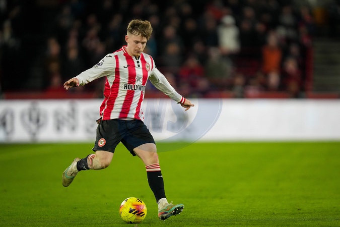 Sepp van den Berg of Brentford runs with the ball during the Premier League match Brentford vs Bournemouth at The Gtech Community Stadium, London, United Kingdom, 27th December 2025, Credit:Maynard Manyowa/News Images / Avalon