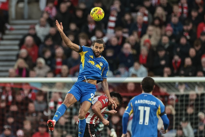 Dominic Calvert-Lewin of Leeds United jumps up to win the high ball during the Premier League match Sunderland vs Leeds United at Stadium Of Light, Sunderland, United Kingdom, 28th December 2025, Credit:Ae Cosgrove/News Images / Avalon