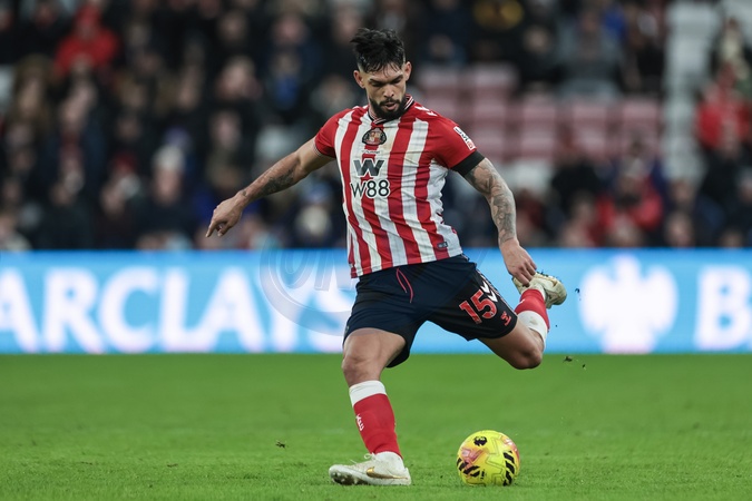 Omar Alderete of Sunderland with the ball during the Premier League match Sunderland vs Leeds United at Stadium Of Light, Sunderland, United Kingdom, 28th December 2025, Credit:Ae Cosgrove/News Images / Avalon