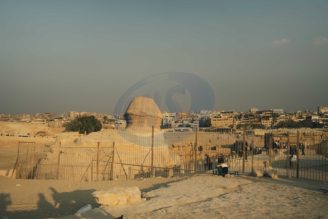 From the back of the sphync, it clearly shows how close the city is. Pyramids Of Giza, Credit:Lounis Tiar / Avalon