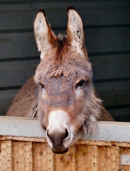 Seasonal weather, Island Farm donkeys on a cold grey day