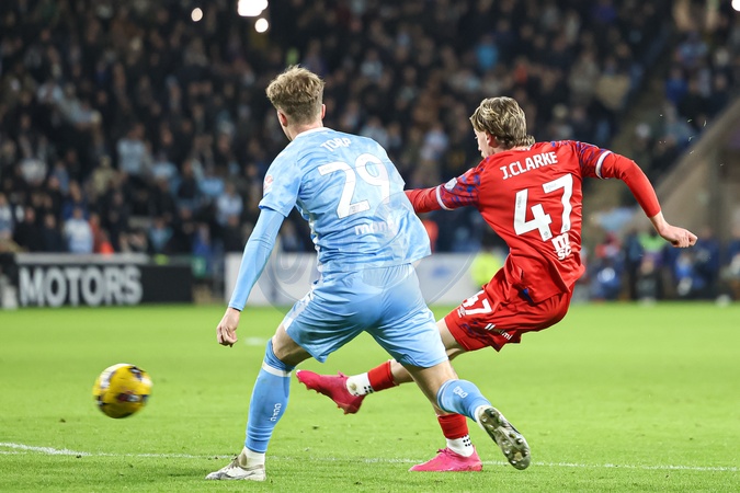 Jack Clarke of Ipswich Town shoots on goal but its saved by Coventry City goalkeeper Carl Rushworth during the Sky Bet Championship match Coventry City vs Ipswich Town at Coventry Building Society Arena, Coventry, United Kingdom, 29th December 2025, Credit:Euan Manning/News Images / Avalon