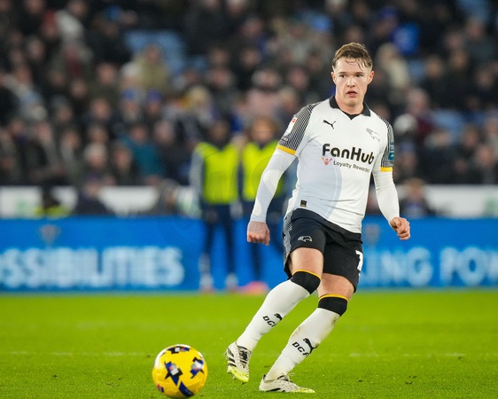 Victor Kristiansen of Leicester City passes the ball during the Sky Bet Championship match Leicester City vs Derby County at King Power Stadium, Leicester, United Kingdom, 29th December 2025, Credit:Maynard Manyowa/News Images / Avalon