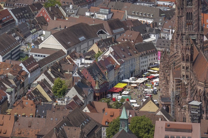 Germany, Freiburg, The Minster Square - Munsterplatz is a picturesque cobblestone square that captures the city's charm and history. Surrounded by historic buildings, some meticulously reconstructed after the ravages of World War II, this square exudes timeless elegance. Photo Fabio Mazzarella/Sintesi *** Local Caption ***, Credit:Fabio Mazzarella / Avalon