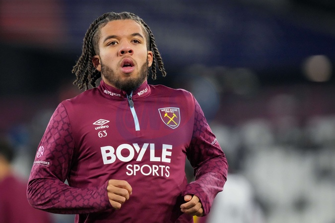 Ezra Mayers of West Ham United warms up during the Premier League match West Ham United vs Brighton and Hove Albion at London Stadium, London, United Kingdom, 30th December 2025, Credit:Maynard Manyowa/News Images / Avalon