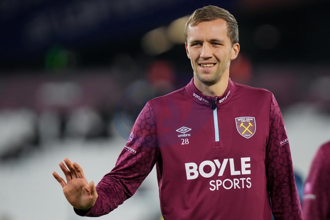 Tomáš Souček of West Ham United waves to a fan during warm up during the Premier League match West Ham United vs Brighton and Hove Albion at London Stadium, London, United Kingdom, 30th December 2025, Credit:Maynard Manyowa/News Images / Avalon