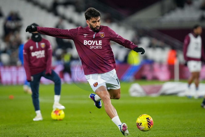 Lucas Paquetá of West Ham United shoots during warm up during the Premier League match West Ham United vs Brighton and Hove Albion at London Stadium, London, United Kingdom, 30th December 2025, Credit:Maynard Manyowa/News Images / Avalon