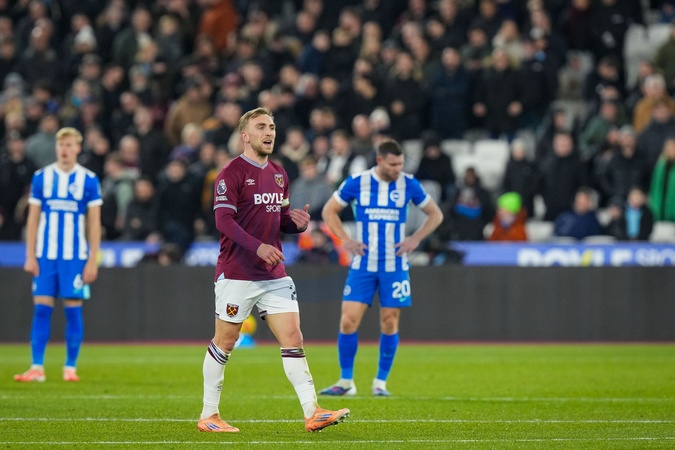 Jarrod Bowen of West Ham United celebrates his goal to make it 1-0 during the Premier League match West Ham United vs Brighton and Hove Albion at London Stadium, London, United Kingdom, 30th December 2025, Credit:Maynard Manyowa/News Images / Avalon