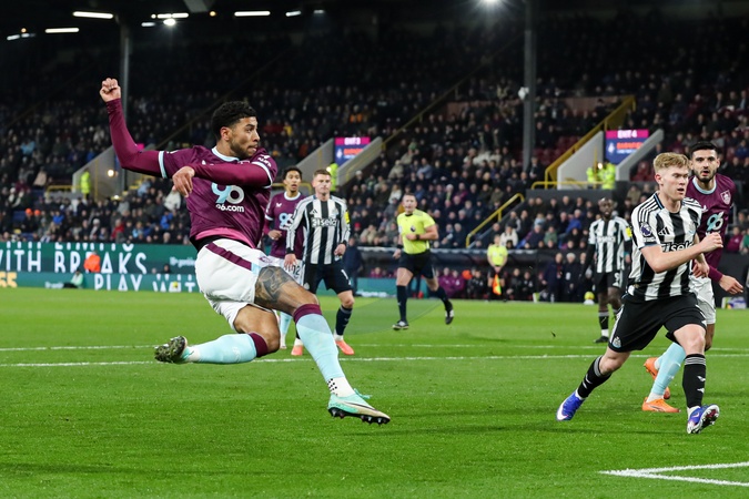 Josh Laurent of Burnley shoots and scores to make it 1-2 during the Premier League match Burnley vs Newcastle United at Turf Moor, Burnley, United Kingdom, 30th December 2025, Credit:Jorge Horsted/News Images / Avalon