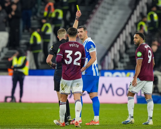 Referee Michael Salisbury gives Lewis Dunk of Brighton & Hove Albion a yellow card during the Premier League match West Ham United vs Brighton and Hove Albion at London Stadium, London, United Kingdom, 30th December 2025, Credit:Maynard Manyowa/News Images / Avalon