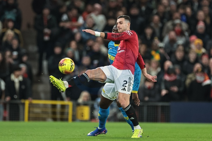Diogo Dalot of Manchester United controls the ball during the Premier League match Manchester United vs Wolverhampton Wanderers at Old Trafford, Manchester, United Kingdom, 30th December 2025, Credit:Mark Cosgrove/News Images / Avalon