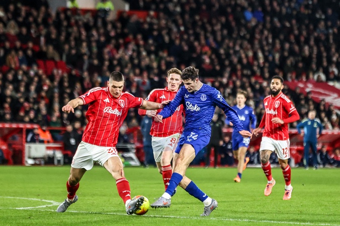 Merlin Rohl of Everton has his shot blocked by Nikola Milenkovic of Nottingham Forest during the Premier League match Nottingham Forest vs Everton at City Ground, Nottingham, United Kingdom, 30th December 2025, Credit:Ae Cosgrove/News Images / Avalon
