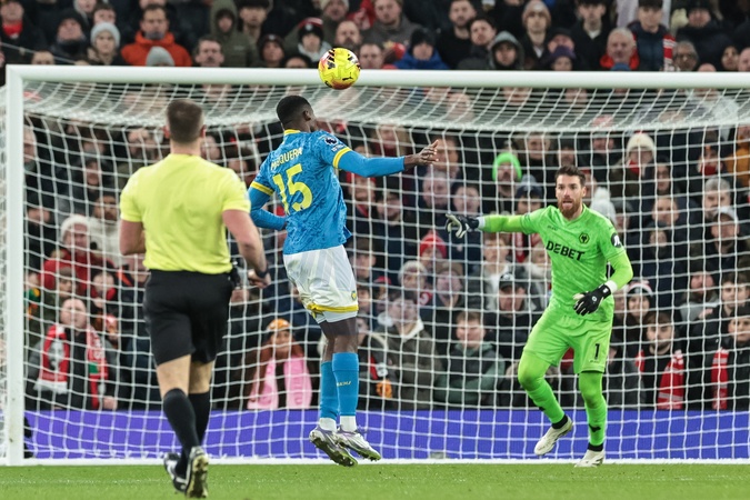 Yerson Mosquera of Wolverhampton Wanderers heads back to Wolverhampton Wanderers goalkeeper Jose Sa and nearly scores an own goal during the Premier League match Manchester United vs Wolverhampton Wanderers at Old Trafford, Manchester, United Kingdom, 30th December 2025, Credit:Mark Cosgrove/News Images / Avalon