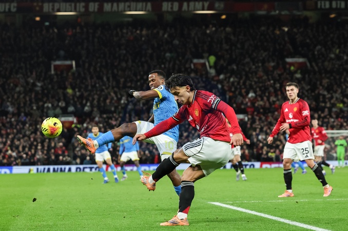 Lisandro Martinez of Manchester United clears the ball up field during the Premier League match Manchester United vs Wolverhampton Wanderers at Old Trafford, Manchester, United Kingdom, 30th December 2025, Credit:Mark Cosgrove/News Images / Avalon