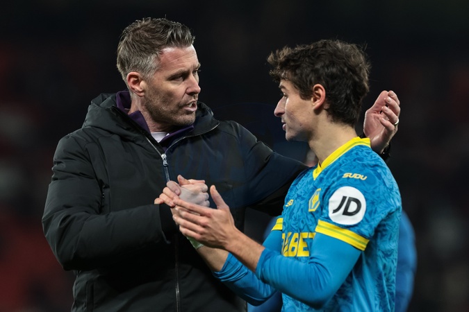 Rob Edwards manager of Wolverhampton Wanderers shakes hands with Hugo Bueno of Wolverhampton Wanderers during the Premier League match Manchester United vs Wolverhampton Wanderers at Old Trafford, Manchester, United Kingdom, 30th December 2025, Credit:Mark Cosgrove/News Images / Avalon