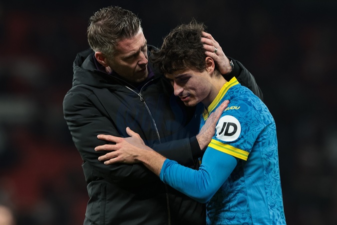 Rob Edwards manager of Wolverhampton Wanderers embraces Hugo Bueno of Wolverhaton Wanderers during the Premier League match Manchester United vs Wolverhampton Wanderers at Old Trafford, Manchester, United Kingdom, 30th December 2025, Credit:Mark Cosgrove/News Images / Avalon