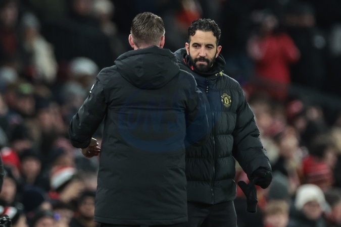 Ruben Amorim manager of Manchester United shakes hands with Rob Edwards manager of Wolverhampton Wanderers as honours are even at 1-1 during the Premier League match Manchester United vs Wolverhampton Wanderers at Old Trafford, Manchester, United Kingdom, 30th December 2025, Credit:Mark Cosgrove/News Images / Avalon