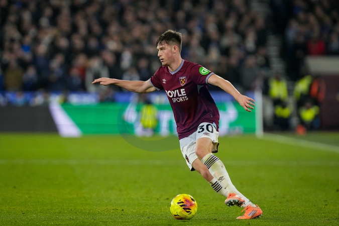 Oliver Scarles of West Ham United makes a run with the ball during the Premier League match West Ham United vs Brighton and Hove Albion at London Stadium, London, United Kingdom, 30th December 2025, Credit:Maynard Manyowa/News Images / Avalon