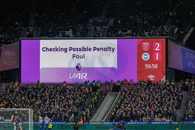 VAR checks for a penalty for Brighton during the Premier League match West Ham United vs Brighton and Hove Albion at London Stadium, London, United Kingdom, 30th December 2025, Credit:Maynard Manyowa/News Images / Avalon