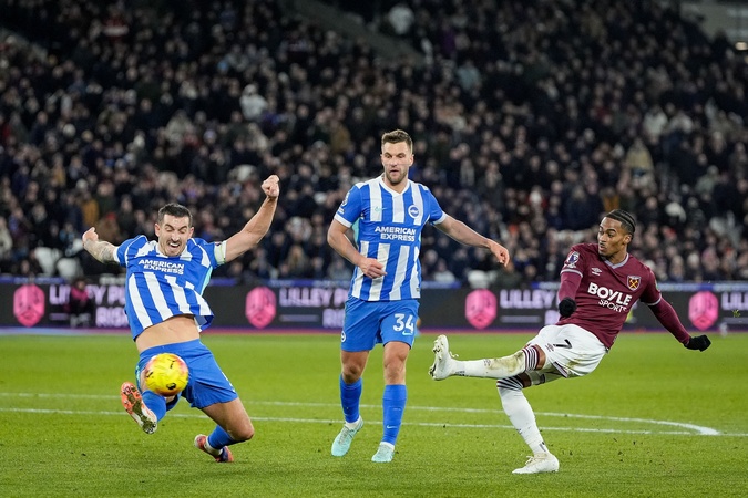 Lewis Dunk of Brighton & Hove Albion dives to block a shot on goal from Crysencio Summerville of West Ham United during the Premier League match West Ham United vs Brighton and Hove Albion at London Stadium, London, United Kingdom, 30th December 2025, Credit:Maynard Manyowa/News Images / Avalon