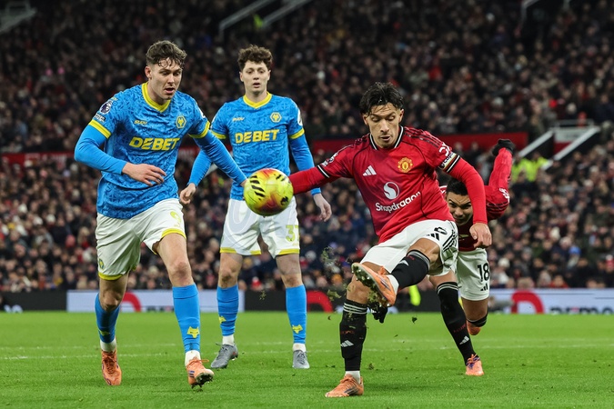 Lisandro Martinez of Manchester United clears the ball up field during the Premier League match Manchester United vs Wolverhampton Wanderers at Old Trafford, Manchester, United Kingdom, 30th December 2025, Credit:Mark Cosgrove/News Images / Avalon