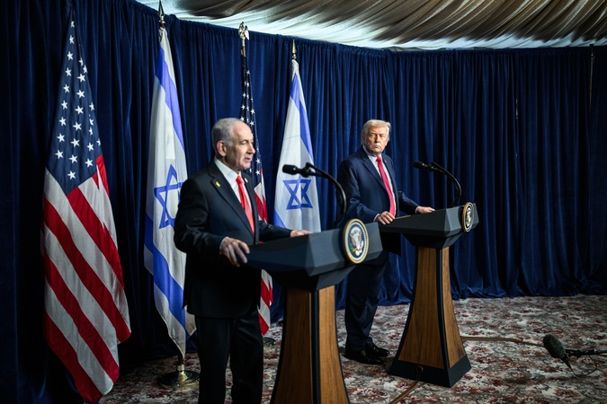 President Donald Trump participates in a bilateral press conference with Israeli Prime Minister Benjamin Netanyahu, Monday, December 29, 2025, at the Mar-a-Lago Club in Palm Beach, Florida., Credit:Daniel Torok / Avalon