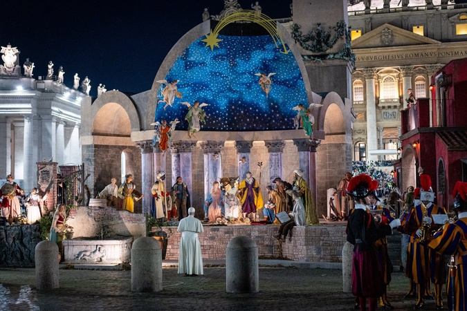 Pope Leo XIV stops for a moment of prayer in front of the nativity scene that adorns St. Peter's Square in Vatican City, Vatican on 31 December 2025.