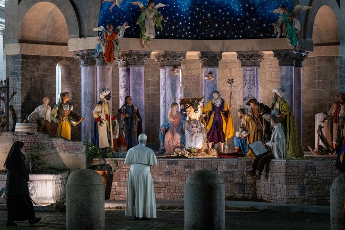 Pope Leo XIV stops for a moment of prayer in front of the nativity scene that adorns St. Peter's Square in Vatican City, Vatican on 31 December 2025.