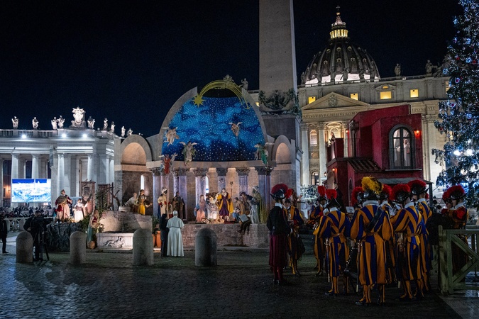 Pope Leo XIV stops for a moment of prayer in front of the nativity scene that adorns St. Peter's Square in Vatican City, Vatican on 31 December 2025.