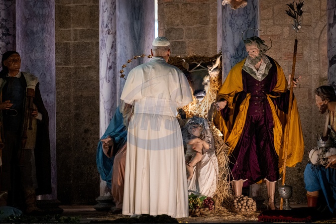Pope Leo XIV stops for a moment of prayer in front of the nativity scene that adorns St. Peter's Square in Vatican City, Vatican on 31 December 2025.